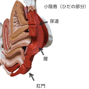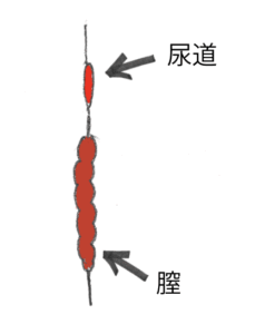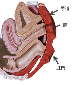 真横から見ると、お腹側から背中側に向かって、尿道と膀胱、膣と子宮、肛門と直腸、の順に並んでいます。